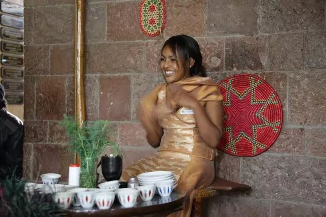 咖啡仪式(编者注:咖啡仪式类似中国的茶艺,通常包括主人亲自烹煮咖啡和邀请客人闻香、品尝等程序)通常持续两个小时左右,是非常重要的社交场合:往往在家庭团聚、朋友聚会和商议社区事务时举行,能被邀请到一个埃塞家庭参加咖啡仪式是极高的礼遇。