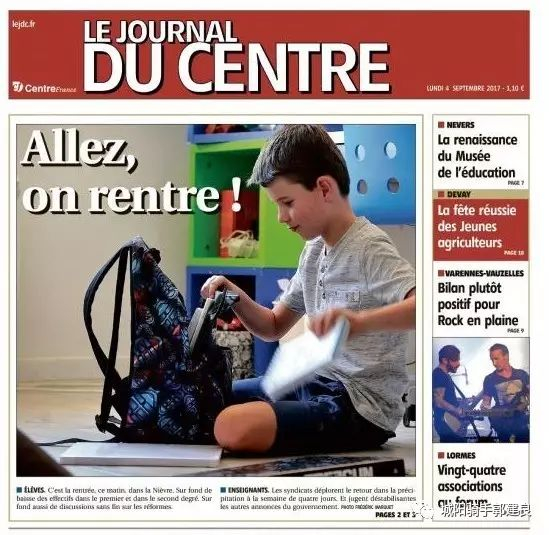 2017年9月4日法国《中心日报》头版照片也很有意思,一个小男孩坐在地上整理自己的书包,压图大字标题是新闻报道,也是一种现实呼唤:“来吧,我们回学校!”(Allez, on rentre!)照片轻松幽默,标题亲切实用。