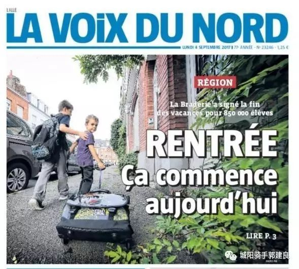 2017年9月4日出版的《北方之声报》(LaVoix du Nordan)头版头条,通栏照片拍得有些夸张,夸大了孩子的书包。画面主体形象是两个走在上学路上的小学生,大孩儿照顾这小孩子,小孩拖着带轮子的大书包,摄影者用广角镜头从他们身后拍摄,凸显了书包的“大”。压图大字标题:“返校,今天开始”