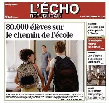 2017年9月4日法国《共和党回声报》(L‘Écho Républicain)头版主图拍得比较友好,两位小学生手拉手去上学。相关文章的标题是,“8万小学生正在上学途中”。