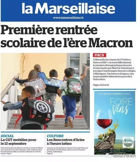 尽管法国总统马克龙在开学第一天客串小学教师,居然没有法国报纸肯在头版使用总统亲自上讲台讲课的照片,但是还是在2017年9月4日《马赛报》(La Marseillaise)头版看到了“马克龙”的名字。该报头版照片拍得很一般,一帮背着书包爬楼梯孩子的背影。但是,相关文章的标题新鲜:“开学第一天,马克龙就读过的小学”。