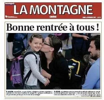 2017年9月4日出版的法国《山报》(La Montagne)头版,头条通栏照片拍得很温情:母亲在亲吻女儿脸,背着书包的女儿笑得很开心地看着镜头。相关文章的标题:“欢迎大家回校!”(Bonnerentrée à tous !)