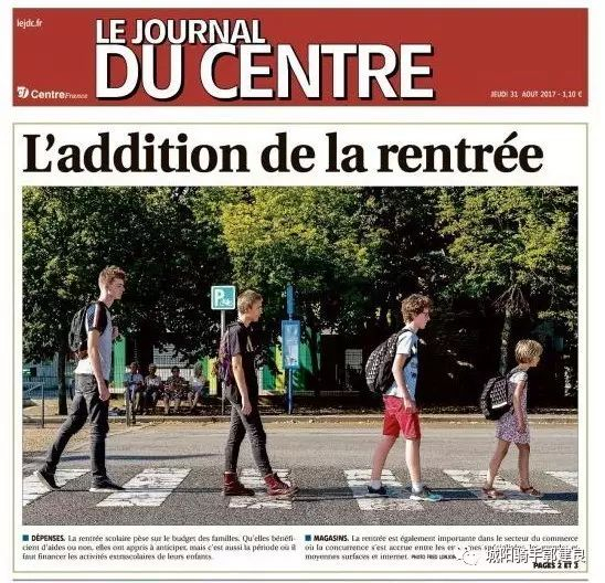 2017年8月31日法国《中心日报》(Le Journal du Centre)头版头条,在“新学期将开始”(L’addition de la rentrée)的通栏标题下,通栏使用了一幅很幽默的照片:由低到高四个背着书包的学生正在过马路,仿佛有人喊口令一样,他们迈着同样的步伐,步调一致、整齐划一,但是每个孩子都不快乐,脸上都是郁闷的表情。个子越小、年级越低的学生背的书包越大,装的东西越多。远处背景长条椅子上恰好坐着四位老人,正悠闲地看着上学的孩子们。这显然是一幅经过设计的摆拍作品,学生们走的斑马线也明明奇妙地不是横着马路画的而是顺着马路画的。多少有些吐槽的意味,好玩,但是不像《尼斯晨报》头版图片那样富有“服务性”。