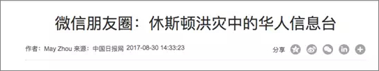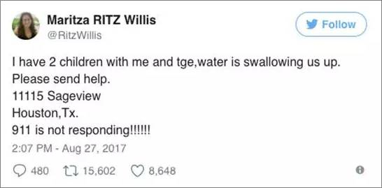 休斯顿华人子林的房屋被淹后,她在微信朋友圈发布求救信息,恳求大家营救她的家人和两个年幼的孩子。很快她的信息在各微信群流转,最终她们一家成功获救。