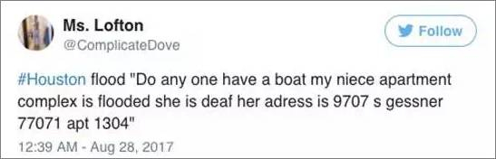 ▲ #休斯顿水灾# 有没有人能救救我的侄女!她的公寓被淹了,她耳朵又听不见。