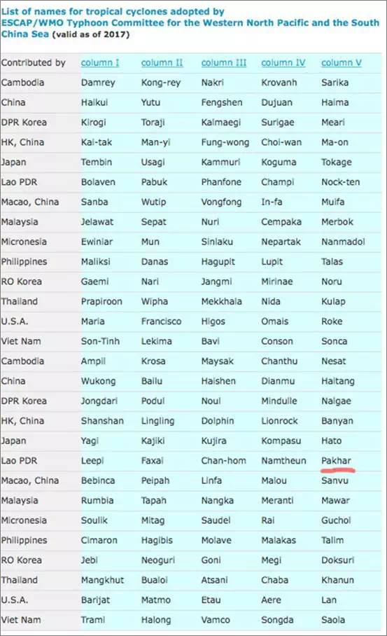 西北太平洋和南中国海热带气旋命名表由世界气象组织台风委员会制定,名称由世界气象组织台风委员会的14个国家和地区提供,总共140个,循环使用。