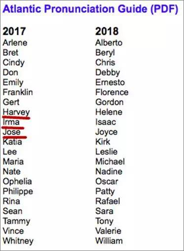 而这次“艾维”飓风的命名则是由世界气象组织下的命名委员会对其命名的。可以看到在2017年的命名表里,这两次飓风“哈维”“艾尔玛”,以及目前新形成的飓风“Jose”都在列。▼