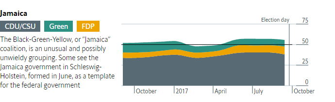 据最新民意调查显示,最有可能的内阁组成是基民盟/社基盟、自民党和绿党联盟(“牙买加”联盟)和基民盟/社基盟和社民党联盟(大联盟)。大联盟即现在的联邦德国政府。