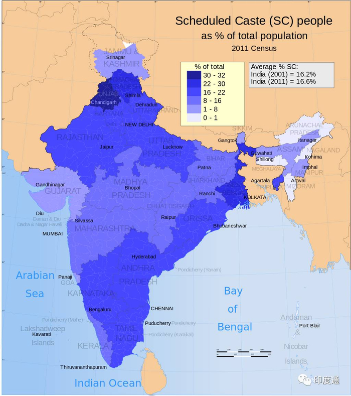 印度最低等级的“不可接触者”人口比例图(2011年印度人口普查,图片来自印度学术研究地图,不代表本平台观点)