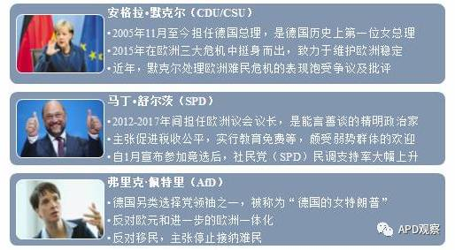 本次德国大选,关注度较高的候选人有基民盟/基社盟(CDU/CSU)的默克尔、社会民主党(SPD)的舒尔茨,以及不太可能胜选,但较为吸引眼球的德国另类选择党(AfD)的佩特里。