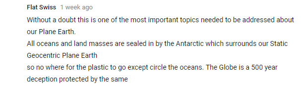 对这个国家极度认同的还有地平说者:“根据地平静态地心学说,全世界的重量都压在南极,塑料漂浮物只可能出现在北半球附近,这是我们学说的明证,你们被地‘球’骗了五百年了”。