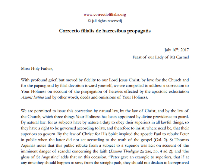 公开信的签署人称,撰写该信件是教宗“精神上的子女”在纠正教宗的“错误”,“教会的规则要求我们,当教会领袖误导教民时,必须打破沉默”。