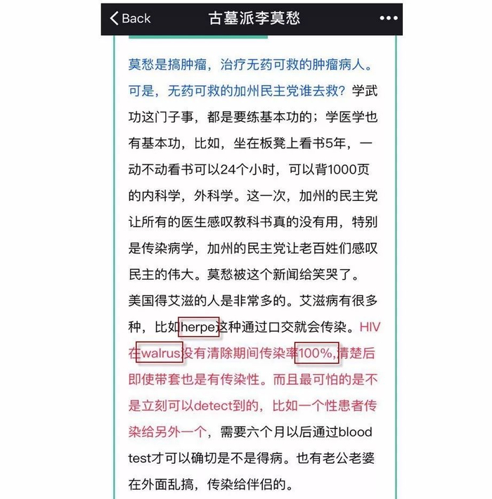以下一篇《加州医生哭了:艾滋病人献血,sex故意传播艾滋病不是重罪》的文章里几乎每句话都有语病和科学错误,很难想象这样一个没有基本医学常识、英文医学名词错误百出的人还能“搞肿瘤”,不是“李莫愁”,明明是李鬼。