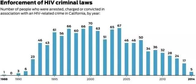 加州HIV犯罪人数(逮捕,指控或被判有罪)一直在逐年减少中,最高年份是70人,2014年有5人,大多数与卖淫相关[5]