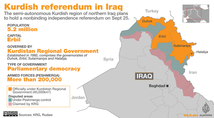 当地时间25日晨,伊拉克库尔德自治区正式开始独立公投。本次公投地区包括库区的三个省份(杜胡克、埃尔比勒和苏莱曼尼亚)及不属于库区但目前由库尔德人控制的基尔库克省。公投区约占伊拉克领土面积的五分之一,有520万人口,超二十万自由战士的军力,且是伊拉克主要产油区。