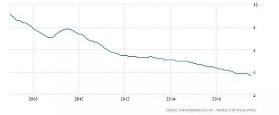 默克尔执政以来大举改革劳工市场,德国失业率处于27年以来的最低点。而且,德国几乎在金融风暴中毫发未损。