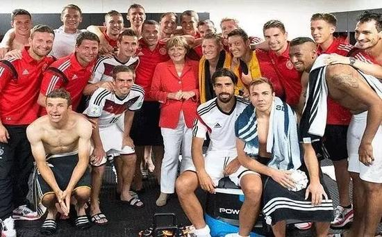 2014年世界杯,德国对战胜阿根廷后,默克尔来到更衣室