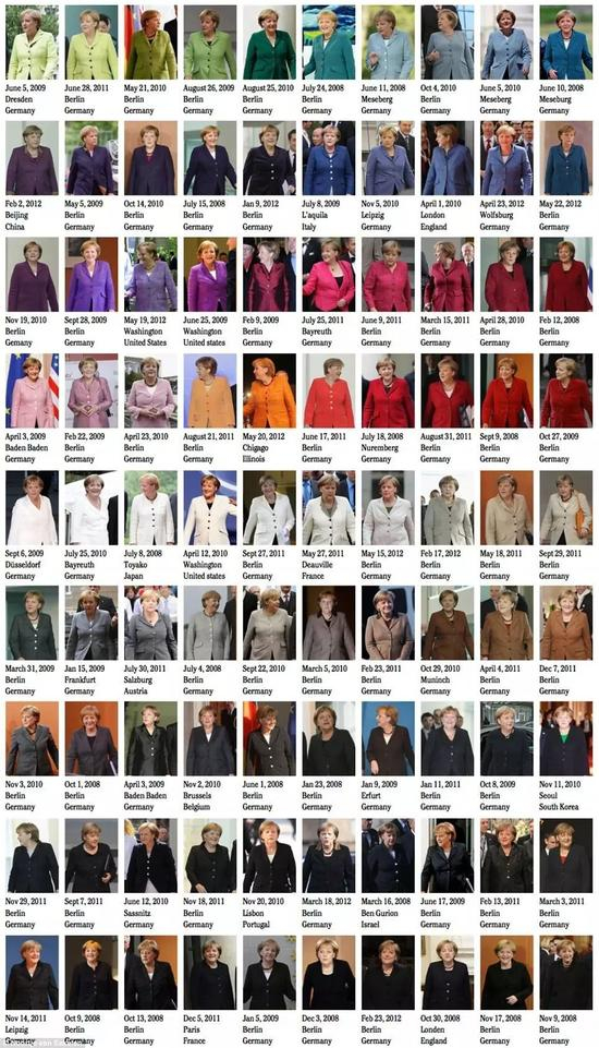 数十年不变的蘑菇头。扣钮外套,长裤、平底鞋,只是根据不同季节和场合而有所变化,显得谨慎、务实、理性。尽管有媒体讽刺她是“德国灰老鼠”,但她依然我行我素。