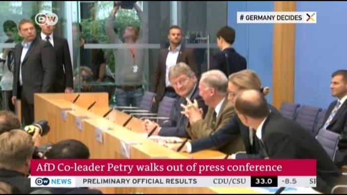 25日,大选结果公布,选择党以13%的票数成为了德国第三大党派,在德国联邦议会将获得94个席位。但是,在25日当天举行的记者发布会上,该党的党主席弗劳克·佩特里却一怒之下从发布会中离场。她宣布,不会代表选择党在联邦议会成为议员,而其它四个州的选择党成员也宣布将另谋新党。