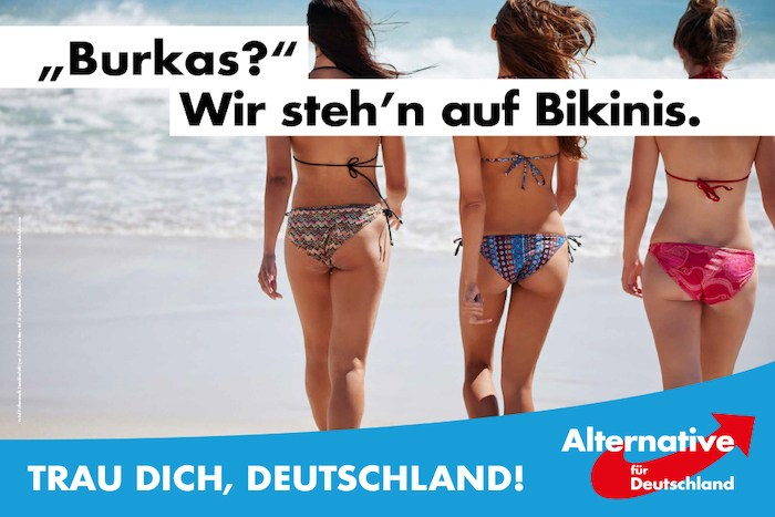 德国选择党在2013年以反欧元为核心诉求建党,此后在默克尔决定大量接受移民时,开始将反移民、反对德国伊斯兰化纳为其核心议题,并借此机会快速扩大其支持者数量。在大选前夕的竞选运动中,选择党展示的广告里囊获了包括“比基尼而非黑袍子”、“停止伊斯兰化”等口号。