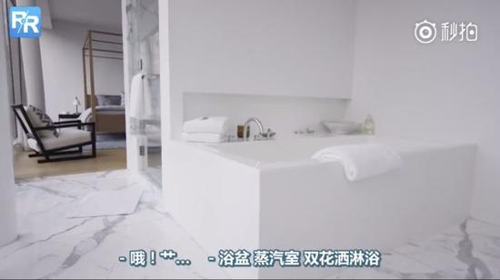 浴室里有浴缸、蒸汽室,还有双花洒淋浴,而且也是落地窗。