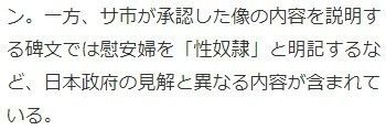 根据《产经新闻》的说法,日本政府对“慰安妇”有“不同的见解”,和纪念雕像上“性奴隶”的注解不同。