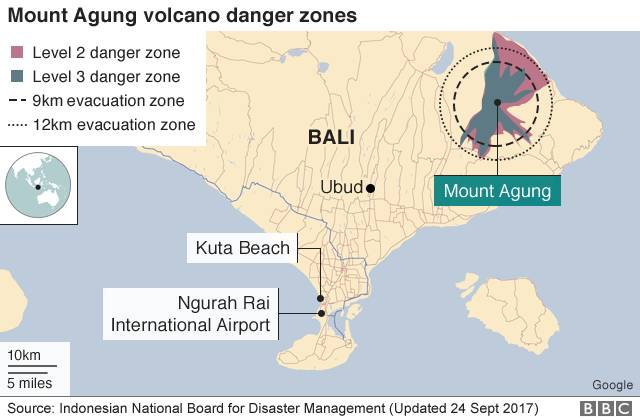 这座火山位于巴厘岛北部,自8月起就开始隆隆作响,出现了要喷发的明显迹象。几名科学家预测这座火山随时都可能喷发,特别是鉴于最近这里发生了数百次地震。