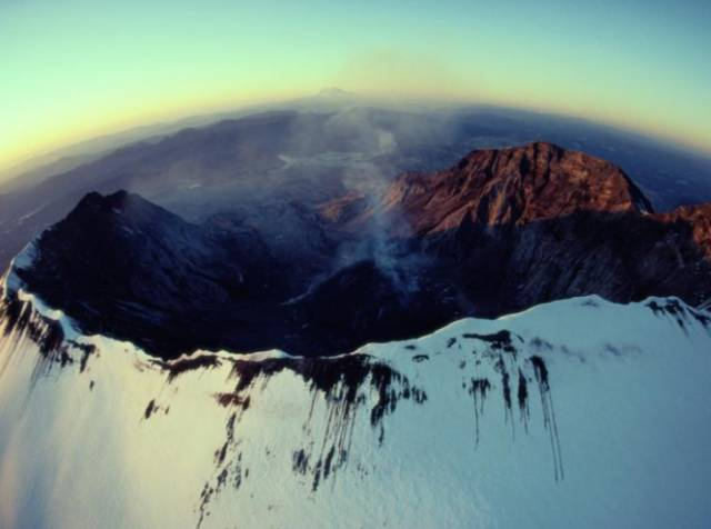 A wisp of smoke escapes from Mount St。 Helens’ dramatic eggshell-shaped crater after an eruption。 Washington State’s volcano is most famous for its catastrophic 1980 eruption that killed 57 people, destroyed homes, bridges, and highways, and triggered an enormous debris avalanche that carved a mile-wide (1.6-kilometer-wide) crater on the mountain。