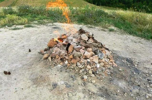 This small mound of rocks would be an ominous mountain only to an insect but does have a constant jet of flames issuing from its apex。 The flame is the result of a natural gas vent that combusts when the gas reacts with the surface oxygen。