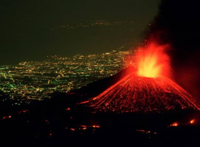 Perched above the lighted city of Catania, Italy, Mount Etna hurls a fountain of fire skyward as rivers of lava spill down its flanks。 In spite of its dazzling displays, Mount Etna is a relatively safe volcano with rare, compact eruptions and slow-flowing lava that gives people a chance to escape。