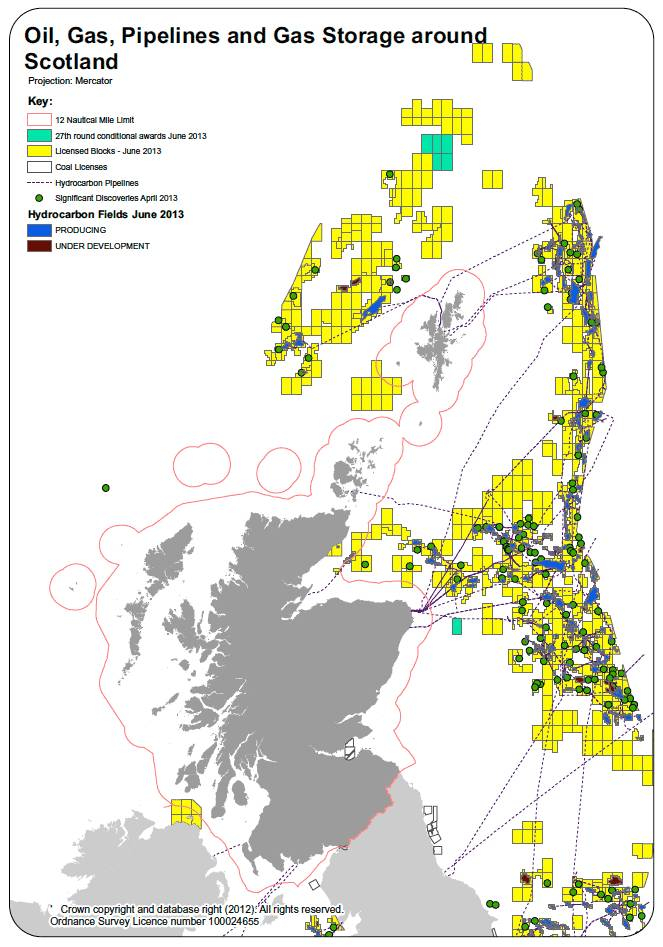 英国的大部分油气田位于苏格兰附近的北海海域。