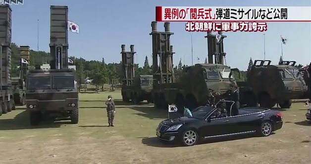 当天,韩军所属亚洲最大的“独岛”号登陆舰和1800吨级“金佐镇”号潜艇停靠司令部练兵场前的码头。文在寅和防长宋永武乘车检阅部队和“韩国型三轴体系”(杀伤链、韩国型导弹防御系统、大规模惩罚报复体系)的核心武器。