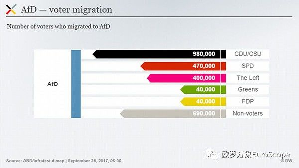 2017年大选中,中间路线的保守派阵营的支持率大幅流失至另类选择党(AfD)。在另类选择党(AfD)这次获得的选票中,有69万张来自上一次大选未参加投票者,还有98万张选票来自以前联盟党(CDU与盟友CSU的联合党)的支持者,47万的支持者来自以前的社民党。但值得注意的是,过半流失选民是出于对于主流政党的不满和失望而转投另类选择党(AfD)。由于主流政党并没有认真对待部分选民担心德国主体文化受到打击和伊斯兰势力在德国扩展太快的忧虑,迎合了这一需求的另类选择党(AfD)成为一部分选民发泄情绪的出口。民调专家在德国广播电台接受采访时表示,另类选择党(AfD)未必能解决实际问题,但它在竞选时抓住了难民这一热点话题,并展示了与主流政党的区别。2017年,随着欧盟-土耳其难民协定的达成,来德国申请避难的人数大幅度减少,另类选择党(AfD)的支持率也相应下降。但在大选10天前,另类选择党(AfD)通过攻击性言论使得难民话题再次发酵。民调专家表示,虽然选民出于抗议把票投给了另类选择党(AfD),但是这并不代表选民完全认同另类选择党(AfD)的排外极端言论。