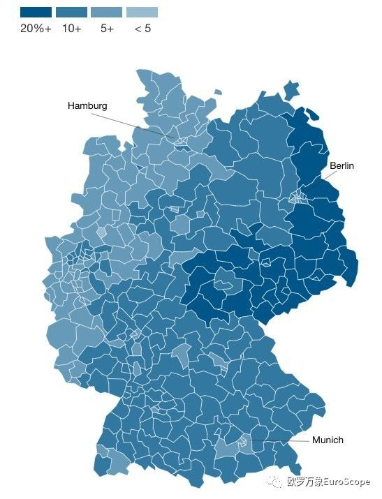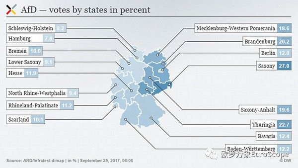 事实上,早在2016年难民危机仍在高潮时,另类选择党(AfD)就在位于德国东部的梅克伦堡─前波美拉尼亚州地方选举中,借助民众对总理默克尔难民政策的不满情绪,一举拿下将近22%的选票,超越默克尔领导的基民盟,成为该州议会第二大政党,而这里恰恰是默克尔的联邦议会选区。但在同年西部的的萨尔州和北威州选举中,该党的支持率仅在10%左右。同样的在2017年的大选,另类选择党(AfD)虽然在西部表现平平,但在东部吸引了大量支持者。