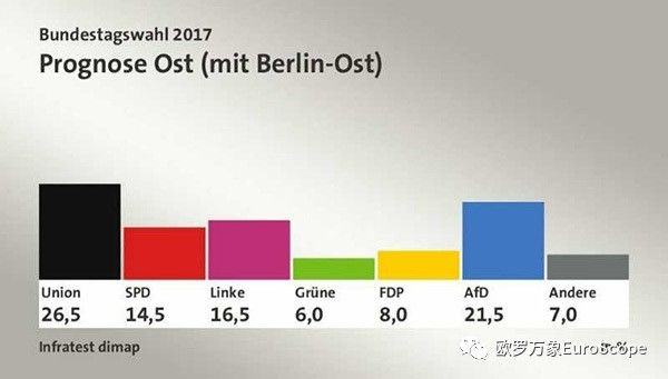 民调机构infratest-dimap的调查显示另类选择党(AfD)在前东德的六个联邦州获得了21.5%的支持率