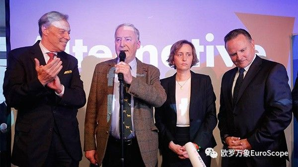 高兰德(左二)在庆祝集会上发表“阻击默克尔”讲话(来源:图片报)