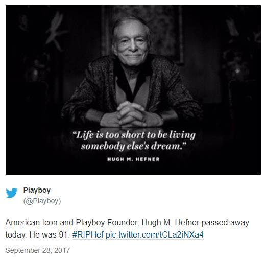 外事儿(微信ID:xjb-waishier)看到,昨天,《花花公子》官方推特发布了一条讣告,其创始人休·海夫纳(Hugh Hefner)去世,享年91岁。