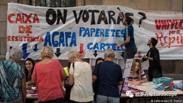在加泰罗尼亚公投问讯处咨询投票信息的民众