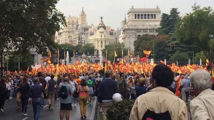 示威群众聚集在市政厅前方的大地女神广场(Plaza de Cibeles),高喊“加泰罗尼亚是西班牙的一部分”、“我是西班牙人、西班牙人、西班牙人!”等口号。这也是西班牙国家足球队出赛时经常喊出的口号。