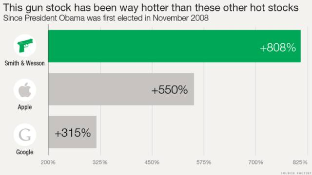 每次枪击案后,奥巴马关于实施枪支管制的强硬措辞均刺激了枪支销量的增长。购买者担心未来更为严厉的枪支管制,于是提前储备更多的枪支弹药以应对可能的新政策。尽管枪支爱好者们很讨厌他,但奥巴马却是投资者眼中的“宠儿”。对他们而言,每次枪击案后,总统奥巴马对枪支管制的拥护,确保了枪支股是个赚钱的好生意。2008年11月到2016年1月,枪支产业股表现非常强劲;American Outdoor Brands (AOBC),也就是Smith & Wesson 的股价在这段时期内涨了八倍,轻松击败了苹果5.5倍和谷歌3.15倍的涨幅。