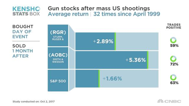根据对冲基金使用定量分析工具Kensho做出的一项分析显示,在美国发生枪击案后的一个月内,Sturm Ruger股价平均涨幅近2.9%,而American Outdoor Brands 则上涨近5.4%。这份研究观察了自1999年4月以来,包括发生在科罗拉多州的哥伦拜恩高中枪击案在内的共32场枪击案后,这两只股票的表现。