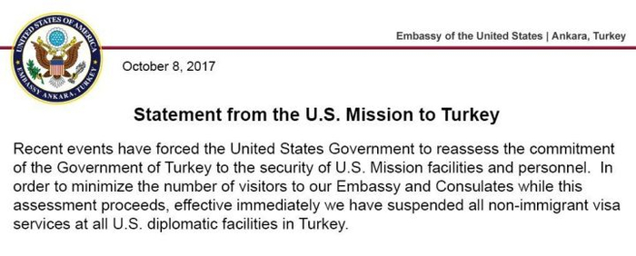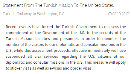 土耳其驻美国大使馆马上还以颜色,宣布立即停止对美国公民的全部签证发放业务。