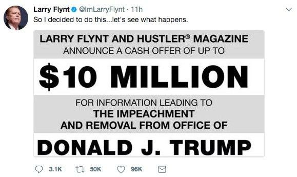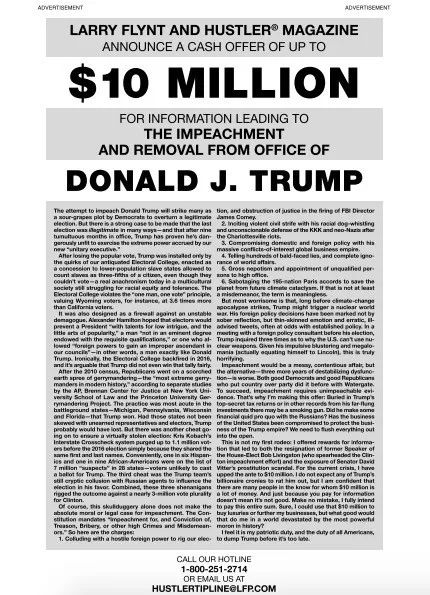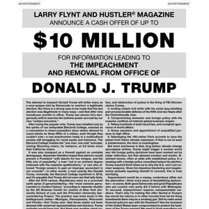 上周六,为了让特朗普被弹劾罢免,美国著名情色杂志《皮条客》的创始人——拉里·弗林特(Larry Flynt)在《华盛顿邮报》上刊登了一则悬赏广告,鼓励爆料者提供有关特朗普“通俄门”证据等的线索。