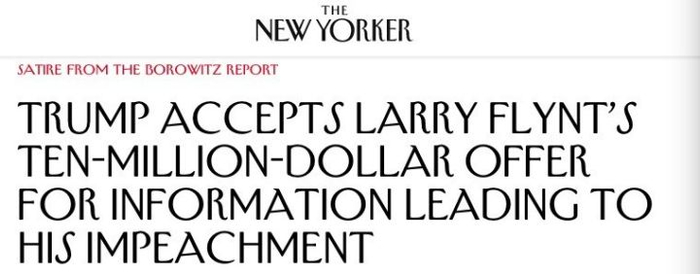 今天,《纽约客》刊登了一篇报道,大意是,这则广告刊登了不到几分钟,特朗普就自己把自己给举报了,然后弗林特转账一千万给特朗普,这件事就这么轻松愉快地解决了。