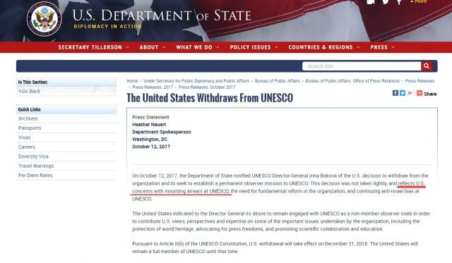 接下来则是重点了:其实美国这次退出联合国教课文组织,除了欠债的问题,一个更主要的缘由是美国政府认为联合国教科文组织“对以色列太不公平”,经常做出“反以色列”(anti-Israel)的决定。