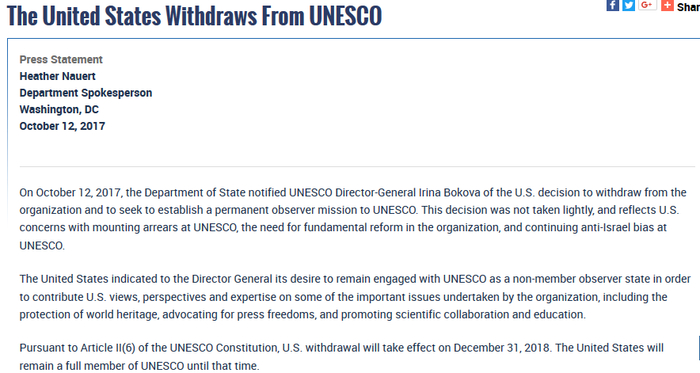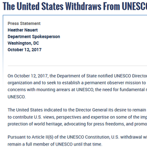 10月12日,美国国务院在官网上发表声明,称欲退出联合国教科文组织,并表示此决定出于多重考虑。联合国教科文组织总干事对此表示遗憾。