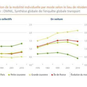 巴黎及郊区交通方式变化:1976-1991年期间,私人汽车使用率稳步增长;2001年以来,公共交通使用者和步行者增长,同期汽车使用率仅在巴黎远郊有所增长,巴黎市区和近郊汽车使用率均呈下降态势。