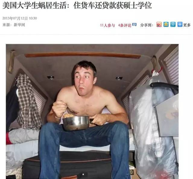 后来,美国一位24岁的汽车工程师也住在厢车的睡袋里,洗澡、健身、一日三餐在公司里解决,5个月终于还清了9万刀助学贷款。