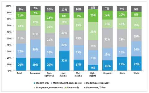 高收入家庭对孩子的学费帮助明显较高:20%包揽全部学费,28%赞助大部分学费;相对来说,中低收入家庭对孩子赞助全部学费的,不到10%;有贷款的家庭赞助孩子上大学的比例,低于无贷款家庭。