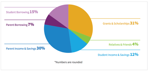 Collegeboard几年前做了《大学生如何付学费》的调查, 总结如下:赠款和tax benefits占36%,借款占26%,家庭和学生本人支付剩下38%。